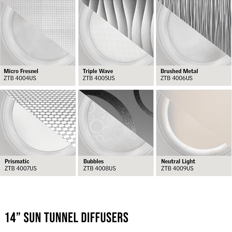 VELUX Sun Tunnel® Diffuser 14 inch, tailored for 14″ diameter Sun Tunnel® skylights, is an essential enhancement that combines utility with aesthetic appeal. These larger diffusers are designed to integrate seamlessly with your interior, enriching both the function and style of your space. Let’s delve into the varied styles and their distinct advantages: